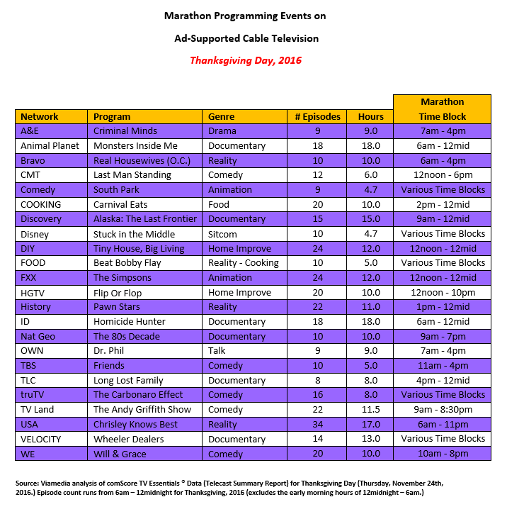 In what has become an annual holiday tradition, the cable industry will be serving up a stack of marathon programming events this Thanksgiving Day, Thursday, November 23rd. And side-by-side with all that great home cookin’ will be a round-the-clock buffet of ad-supported cable programming.