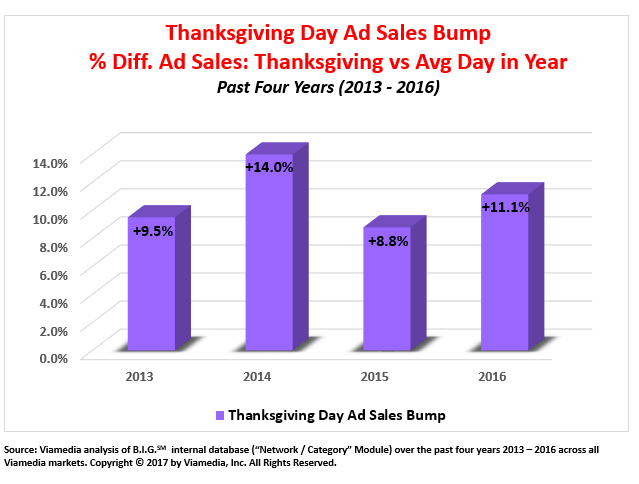 Thanksgiving is a very popular day for cable advertisers nationwide. We looked into our internal records and found that — for each of the past four years – the amount of advertising on Thanksgiving Day was anywhere from 9% – 14% higher than the average day for that year: