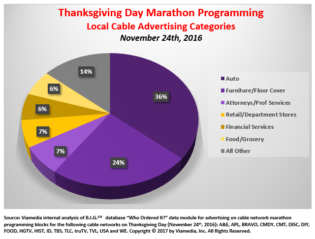 We isolated the day of Thanksgiving, 2016 (November 24th) and found 17 of the above “marathon networks” that exhibited local cable advertising activity during a marathon telecast. In total, 137 clients ordered over 1,000 30-second spots across 47 Viamedia markets (60+% of Viamedia’s nationwide footprint). That comes to an average of 8 spots per advertiser.